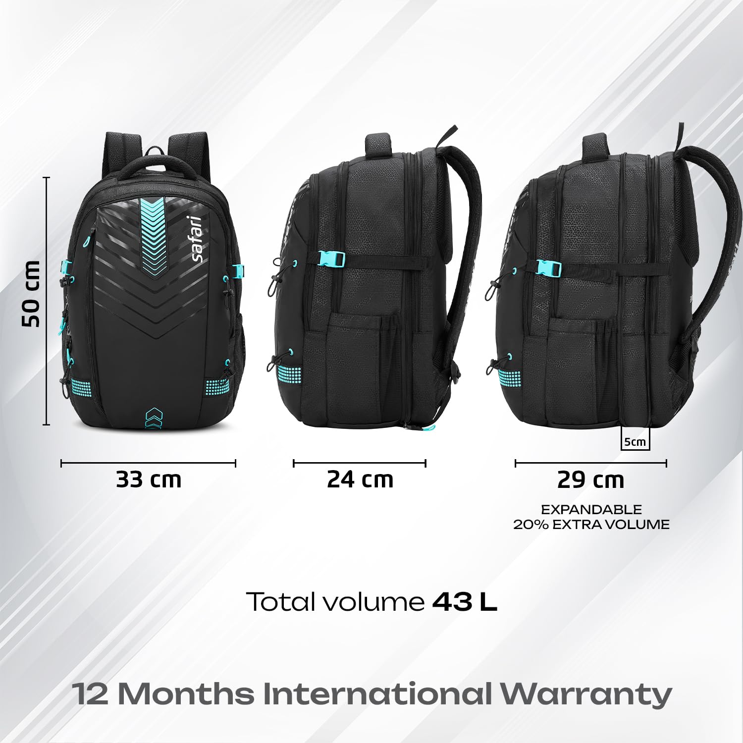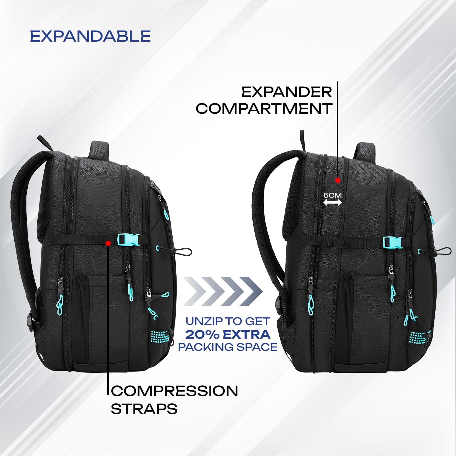 - 3 spacious compartments with an expander (43L capacity) and 17" laptop compatible
