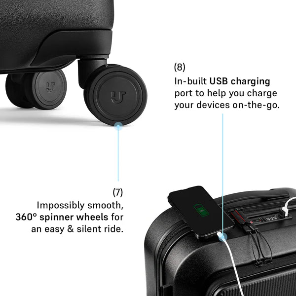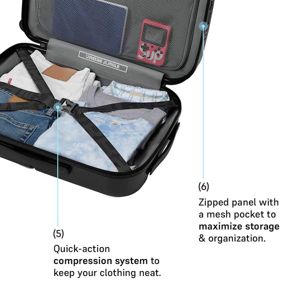 Introducing the Caliber Front Open Trolley – a perfect blend of premium quality and youthful design. Crafted from 100% unbreakable polycarbonate, this trolley ensures unmatched durability. Glide effortlessly with its smooth, silent 360-degree wheels and secure your travels with the internationally recognized keyless TSA lock and anti-theft zipper. Stay connected on the go with the built-in USB charging port. The thoughtfully organized interiors and the front open compartment provide easy access to your laptop and essentials, making travel efficient and stylish. Experience travel reimagined with Urban Jungle’s ultimate companion for modern explorers.